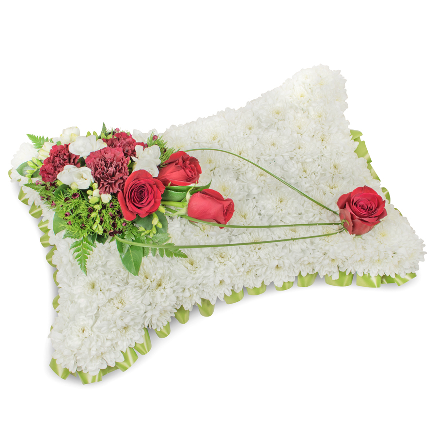 This thoughtfully curated arrangement showcases vibrant white chrysanthemums, bold red roses, gentle white freesias, luxurious dark red carnations, graceful dianthus, and rustic bear grass. Each flower is hand-picked to ensure pristine freshness and artistic design, making it a perfect tribute to honor and remember.