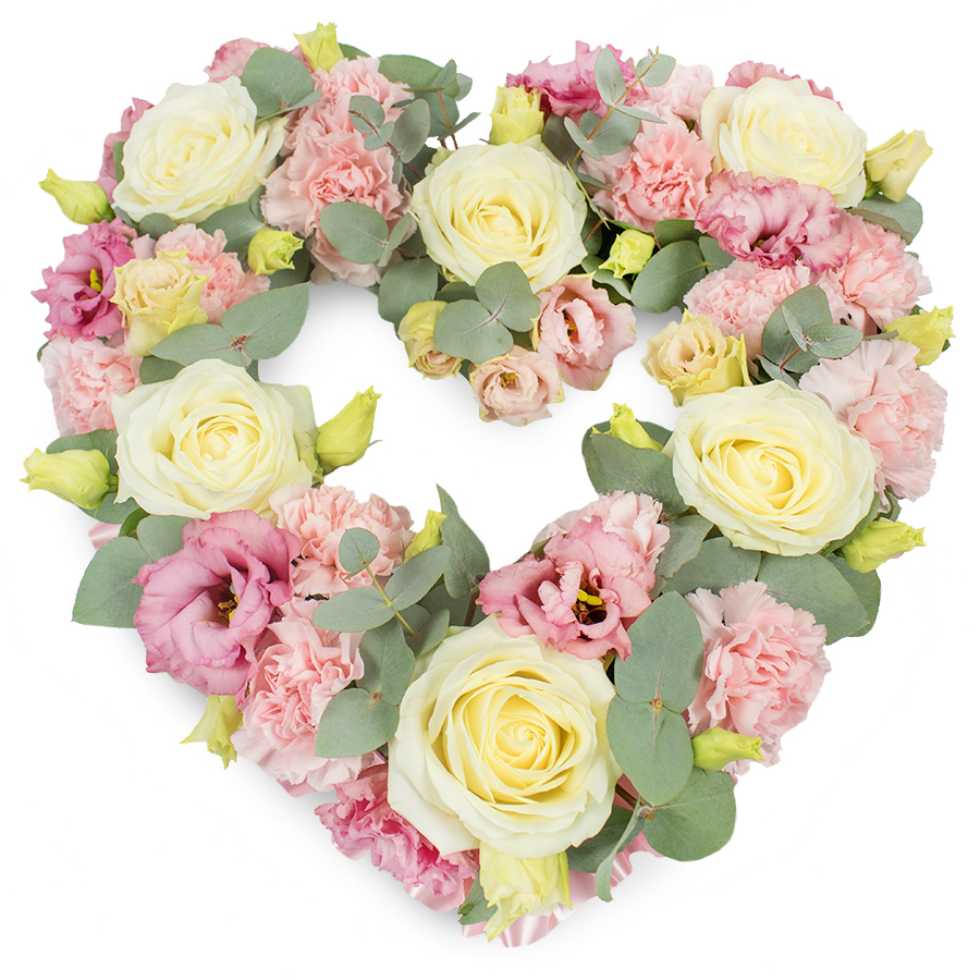 Show your deepest sympathies with our Heartwarming Open Heart Tribute. This exquisite bouquet combines white roses, pink carnations, pink lisianthus, and eucalyptus leaves, thoughtfully arranged to symbolize love, remembrance, and respect.